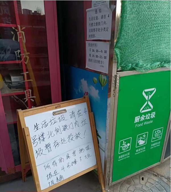 22日下午4时许,小区南门垃圾分类投放点旁的小白板上内容已调整,只剩“生活垃圾请在4号楼北侧铁门垃圾暂存处投放”和“所有的房客扔垃圾在4号楼下垃圾桶”的内容。